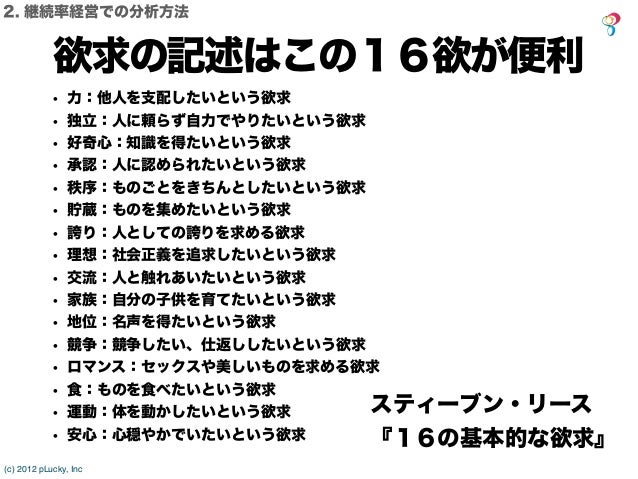 27. 27. 2. 継続率経営での分析方法 欲求の記述はこの16欲が便利 • 力:他人を支配したいという欲求 • 独立:人に頼らず自力でやりたいという欲求 • 好奇心:知識を得たいという欲求 • 承認:人に認められたいという欲求 • 秩序:ものごとをきちんとしたいという欲求 • 貯蔵:ものを集めたいという欲求 • 誇り:人としての誇りを求める欲求 • 理想:社会正義を追求したいという欲求 • 交流:人と触れあいたいという欲求 • 家族:自分の子供を育てたいという欲求 • 地位:名声を得たいという欲求 • 競争:競争したい、仕返ししたいという欲求 • ロマンス:セックスや美しいものを求める欲求 • 食:ものを食べたいという欲求 • 運動:体を動かしたいという欲求 スティーブン・リース • 安心:心穏やかでいたいという欲求 『16の基本的な欲求』(c) 2012 pLucky, Inc