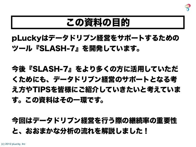 3. 3. この資料の目的 pLuckyはデータドリブン経営をサポートするための ツール『SLASH-7』を開発しています。 今後『SLASH-7』をより多くの方に活用していただ くためにも、データドリブン経営のサポートとなる考 え方やTIPSを皆様にご紹介していきたいと考えていま す。この資料はその一環です。 今回はデータドリブン経営を行う際の継続率の重要性 と、おおまかな分析の流れを解説しました!(c) 2012 pLucky, Inc
