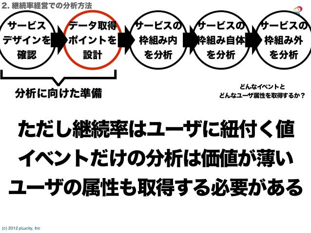 47. 47. 2. 継続率経営での分析方法 サービス データ取得 サービスの サービスの サービスのデザインを ポイントを 枠組み内 枠組み自体 枠組み外 確認 設計 を分析 を分析 を分析 分析に向けた準備 特に継続率を改善する場合 「イベント」と「ユーザ属性」 を常に意識しておく(c) 2012 pLucky, Inc