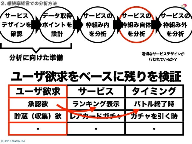 39. 39. 2. 継続率経営での分析方法 サービス データ取得 サービスの サービスの サービスのデザインを ポイントを 枠組み内 枠組み自体 枠組み外 確認 設計 を分析 を分析 を分析 適切なサービスデザインが 分析に向けた準備 行われているか? ユーザ欲求をベースに残りを検証 ユーザ欲求 サービス タイミング 承認欲 ランキング表示 バトル終了時 貯蔵(収集)欲 レアカードガチャ ガチャを引く時 ・ ・ ・(c) 2012 pLucky, Inc