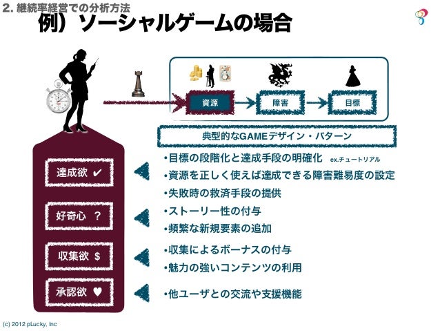 41. 41. 2. 継続率経営での分析方法 例)ソーシャルゲームの場合 資源 障害 目標 典型的なGAMEデザイン・パターン •目標の段階化と達成手段の明確化  ex.チュートリアル 達成欲 ✔ •資源を正しく使えば達成できる障害難易度の設定 •失敗時の救済手段の提供 好奇心 ? •ストーリー性の付与 •頻繁な新規要素の追加 収集欲 $ •収集によるボーナスの付与 •魅力の強いコンテンツの利用 承認欲 ♥ •他ユーザとの交流や支援機能(c) 2012 pLucky, Inc