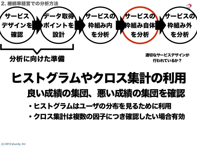 43. 43. 2. 継続率経営での分析方法 サービス データ取得 サービスの サービスの サービスのデザインを ポイントを 枠組み内 枠組み自体 枠組み外 確認 設計 を分析 を分析 を分析 適切なサービスデザインが 分析に向けた準備 行われているか? ヒストグラムやクロス集計の利用 良い成績の集団、悪い成績の集団を確認 ・ヒストグラムはユーザの分布を見るために利用 ・クロス集計は複数の因子につき確認したい場合有効(c) 2012 pLucky, Inc