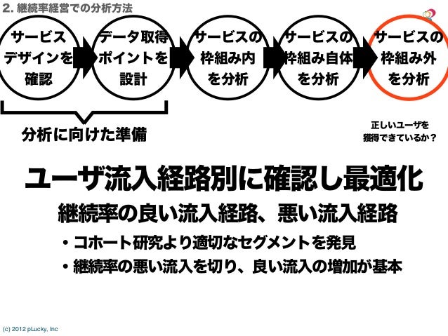 45. 45. 2. 継続率経営での分析方法 サービス データ取得 サービスの サービスの サービスのデザインを ポイントを 枠組み内 枠組み自体 枠組み外 確認 設計 を分析 を分析 を分析 正しいユーザを 分析に向けた準備 獲得できているか? ユーザ流入経路別に確認し最適化 継続率の良い流入経路、悪い流入経路 ・コホート研究より適切なセグメントを発見 ・継続率の悪い流入を切り、良い流入の増加が基本(c) 2012 pLucky, Inc