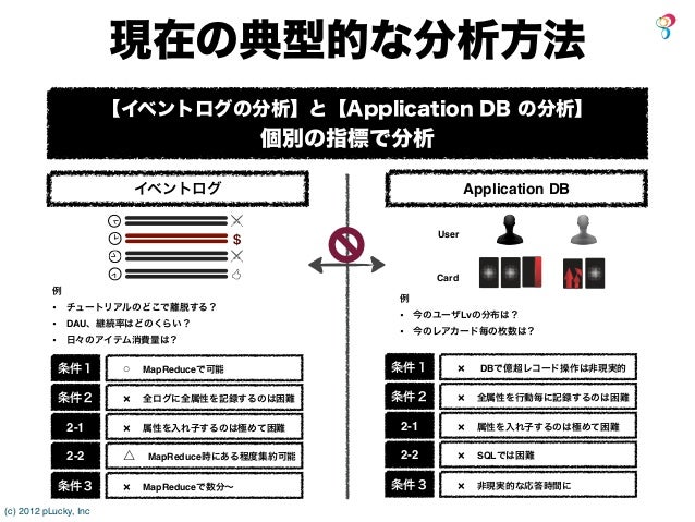 49. 49. 現在の典型的な分析方法 【イベントログの分析】と【Application DB の分析】 個別の指標で分析 イベントログ Application DB User $  Card 例 例 • チュートリアルのどこで離脱する? • 今のユーザLvの分布は? • DAU、継続率はどのくらい? • 今のレアカード毎の枚数は? • 日々のアイテム消費量は? 条件1  ○ MapReduceで可能 条件1  ×  DBで億超レコード操作は非現実的 条件2  × 全ログに全属性を記録するのは困難 条件2  × 全属性を行動毎に記録するのは困難 2-1  × 属性を入れ子するのは極めて困難 2-1  × 属性を入れ子するのは極めて困難 2-2  △ MapReduce時にある程度集約可能 2-2  × SQLでは困難 条件3  × MapReduceで数分∼ 条件3  × 非現実的な応答時間に(c) 2012 pLucky, Inc