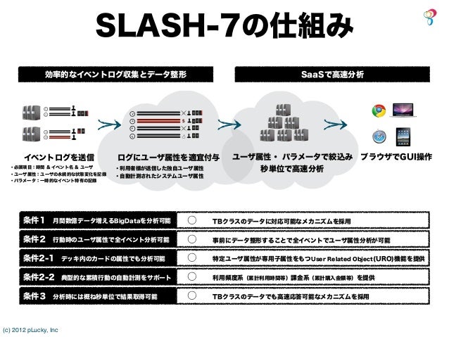 50. 50. SLASH-7の仕組み 効率的なイベントログ収集とデータ整形 SaaSで高速分析 $  イベントログを送信 ログにユーザ属性を適宜付与 ユーザ属性・ パラメータで絞込み ブラウザでGUI操作 ・必須項目:時間 & イベント名 & ユーザ ・利用者様が送信した独自ユーザ属性 秒単位で高速分析 ・ユーザ属性:ユーザの永続的な状態変化を記録 ・自動計測されたシステムユーザ属性 ・パラメータ:一時的なイベント特有の記録 条件1 月間数億データ増えるBigDataを分析可能  ○  TBクラスのデータに対応可能なメカニズムを採用 条件2 行動時のユーザ属性で全イベント分析可能  ○  事前にデータ整形することで全イベントでユーザ属性分析が可能 条件2-1 デッキ内のカードの属性でも分析可能  ○  特定ユーザ属性が専用子属性をもつUser Related Object(URO)機能を提供 条件2-2 典型的な累積行動の自動計測をサポート  ○  利用頻度系(累計利用時間等)課金系(累計購入金額等)を提供 条件3 分析時には概ね秒単位で結果取得可能  ○  TBクラスのデータでも高速応答可能なメカニズムを採用(c) 2012 pLucky, Inc