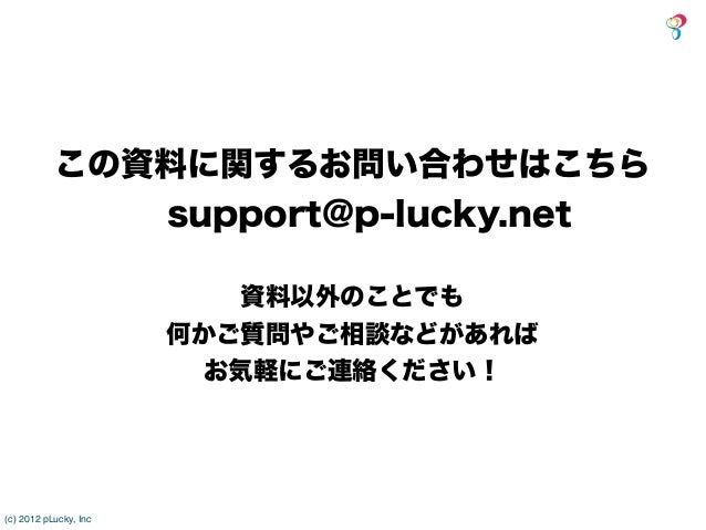 51. 51. この資料に関するお問い合わせはこちら support@p-lucky.net 資料以外のことでも 何かご質問やご相談などがあれば お気軽にご連絡ください!(c) 2012 pLucky, Inc
