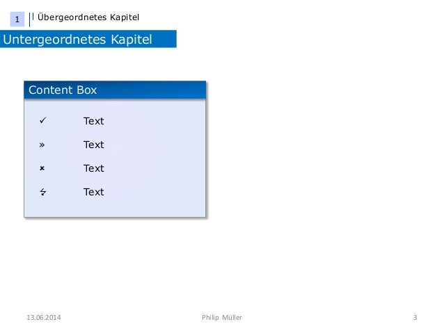 3. 3. 13.06.2014 Philip Müller 3 Übergeordnetes Kapitel Untergeordnetes Kapitel 1 Content Box  Text » Text  Text  Text