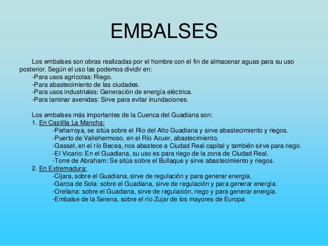 10. 10. EMBALSESLos embalses son obras realizadas por el hombre con el fin de almacenar aguas para su usoposterior. Según el uso las podemos dividir en:-Para usos agrícolas: Riego.-Para abastecimiento de las ciudades.-Para usos industriales: Generación de energía eléctrica.-Para laminar avenidas: Sirve para evitar inundaciones.Los embalses más importantes de la Cuenca del Guadiana son:1. En Castilla La Mancha:-Peñarroya, se sitúa sobre el Río del Alto Guadiana y sirve abastecimiento y riegos.-Puerto de Vallehermoso, en el Río Azuer, abastecimiento,-Gasset, en el río Becea, nos abastece a Ciudad Real capital y también sirve para riego.-El Vicario: En el Guadiana, su uso es para riego de la zona de Ciudad Real.-Torre de Abraham: Se sitúa sobre el Bullaque y sirve abastecimiento y riegos.2. En Extremadura:-Cijara, sobre el Guadiana, sirve de regulación y para generar energía.-Garcia de Sola: sobre el Guadiana, sirve de regulación y para generar energía.-Orellana: sobre el Guadiana, sirve de regulación, riego y para generar energía.-Embalse de la Serena, sobre el río Zujar de los mayores de Europa
