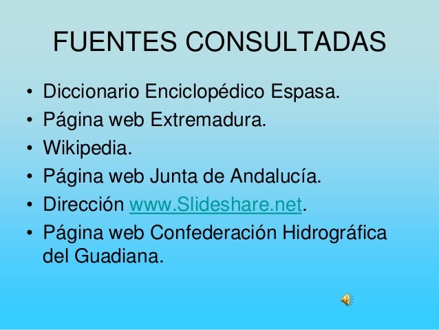 14. 14. FUENTES CONSULTADAS• Diccionario Enciclopédico Espasa.• Página web Extremadura.• Wikipedia.• Página web Junta de Andalucía.• Dirección www.Slideshare.net.• Página web Confederación Hidrográficadel Guadiana.