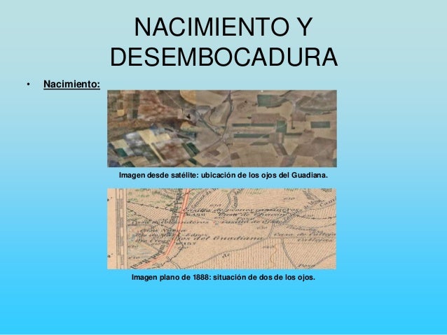 NACIMIENTO YDESEMBOCADURA• Nacimiento:Imagen desde satélite: ubicación de los ojos del Guadiana.Imagen plano de 1888: situ...
