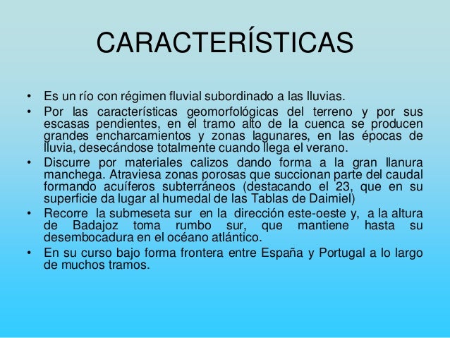 6. 6. CARACTERÍSTICAS• Es un río con régimen fluvial subordinado a las lluvias.• Por las características geomorfológicas del terreno y por susescasas pendientes, en el tramo alto de la cuenca se producengrandes encharcamientos y zonas lagunares, en las épocas delluvia, desecándose totalmente cuando llega el verano.• Discurre por materiales calizos dando forma a la gran llanuramanchega. Atraviesa zonas porosas que succionan parte del caudalformando acuíferos subterráneos (destacando el 23, que en susuperficie da lugar al humedal de las Tablas de Daimiel)• Recorre la submeseta sur en la dirección este-oeste y, a la alturade Badajoz toma rumbo sur, que mantiene hasta sudesembocadura en el océano atlántico.• En su curso bajo forma frontera entre España y Portugal a lo largode muchos tramos.