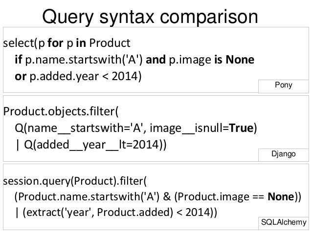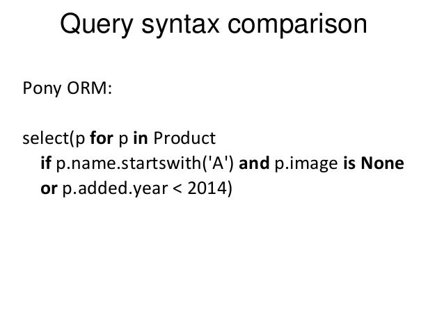 10. 10. Pony ORM: select(p for p in Product if p.name.startswith('A') and p.image is None or p.added.year < 2014) Query syntax comparison