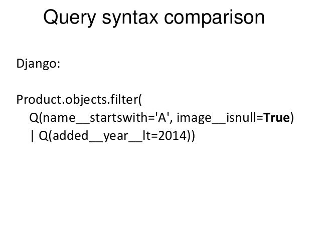 11. 11. Django: Product.objects.filter( Q(name__startswith='A', image__isnull=True) | Q(added__year__lt=2014)) Query syntax comparison