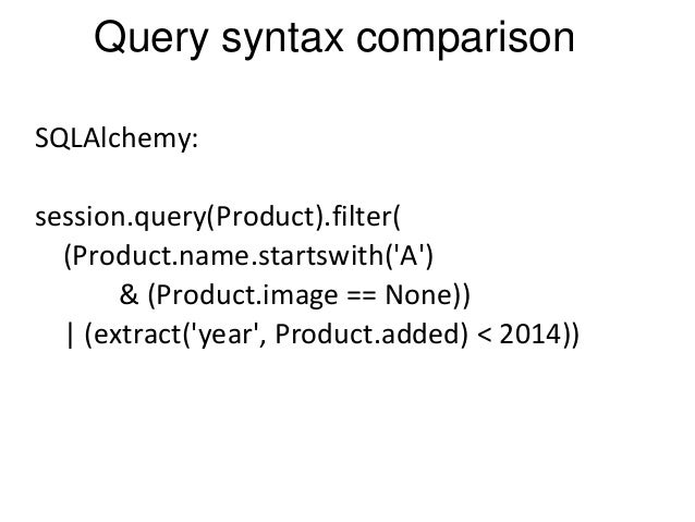 12. 12. SQLAlchemy: session.query(Product).filter( (Product.name.startswith('A') & (Product.image == None)) | (extract('year', Product.added) < 2014)) Query syntax comparison