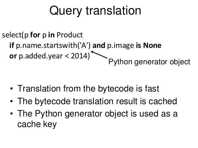 14. 14. Query translation select(p for p in Product if p.name.startswith('A') and p.image is None or p.added.year < 2014) • Translation from the bytecode is fast • The bytecode translation result is cached • The Python generator object is used as a cache key Python generator object