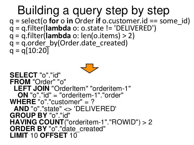 15. 15. Building a query step by step q = select(o for o in Order if o.customer.id == some_id) q = q.filter(lambda o: o.state != 'DELIVERED') q = q.filter(lambda o: len(o.items) > 2) q = q.order_by(Order.date_created) q = q[10:20] SELECT "o"."id" FROM "Order" "o" LEFT JOIN "OrderItem" "orderitem-1" ON "o"."id" = "orderitem-1"."order" WHERE "o"."customer" = ? AND "o"."state" <> 'DELIVERED' GROUP BY "o"."id" HAVING COUNT("orderitem-1"."ROWID") > 2 ORDER BY "o"."date_created" LIMIT 10 OFFSET 10