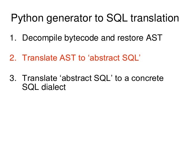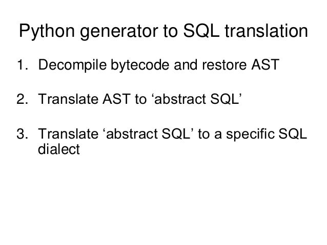 31. 31. Python generator to SQL translation 1. Decompile bytecode and restore AST 2. Translate AST to ‘abstract SQL’ 3. Translate ‘abstract SQL’ to a concrete SQL dialect
