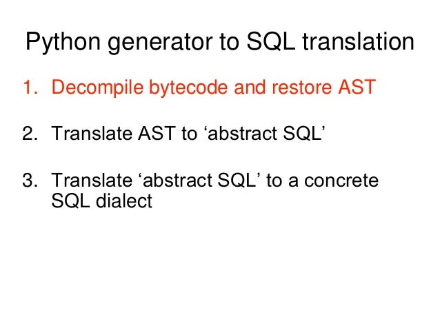 17. 17. Python generator to SQL translation 1. Decompile bytecode and restore AST 2. Translate AST to ‘abstract SQL’ 3. Translate ‘abstract SQL’ to a specific SQL dialect