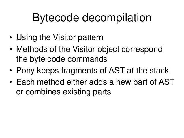 19. 19. Bytecode decompilation • Using the Visitor pattern • Methods of the Visitor object correspond the byte code commands • Pony keeps fragments of AST at the stack • Each method either adds a new part of AST or combines existing parts