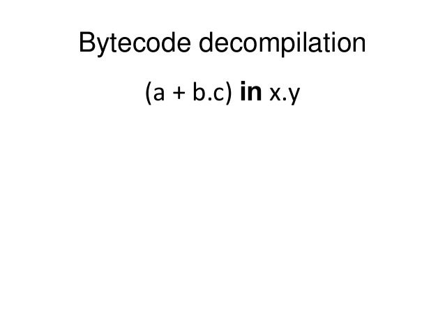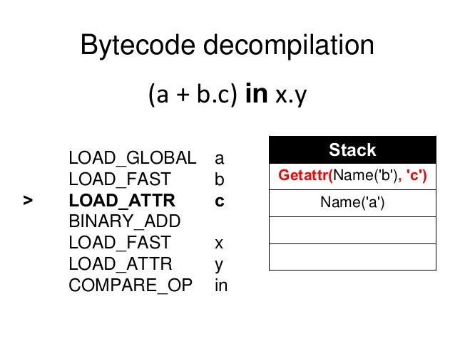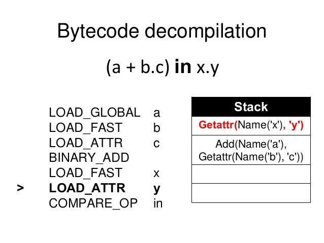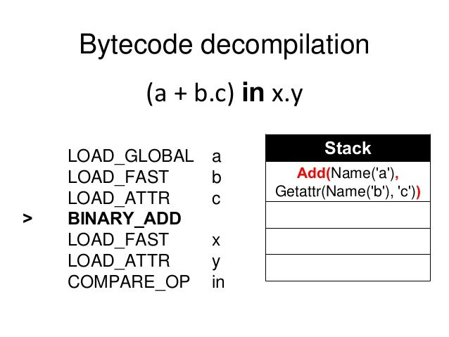 26. 26. (a + b.c) in x.y LOAD_GLOBAL a LOAD_FAST b LOAD_ATTR c > BINARY_ADD LOAD_FAST x LOAD_ATTR y COMPARE_OP in Stack Add(Name('a'), Getattr(Name('b'), 'c')) Bytecode decompilation