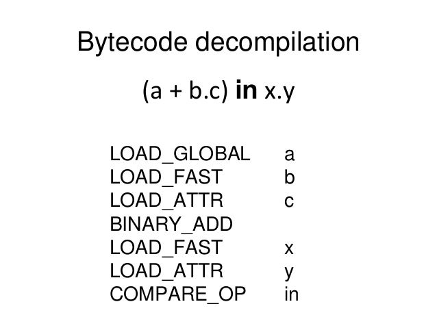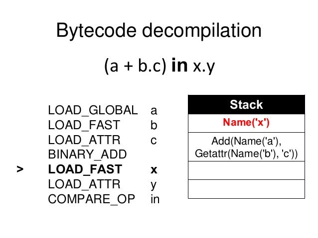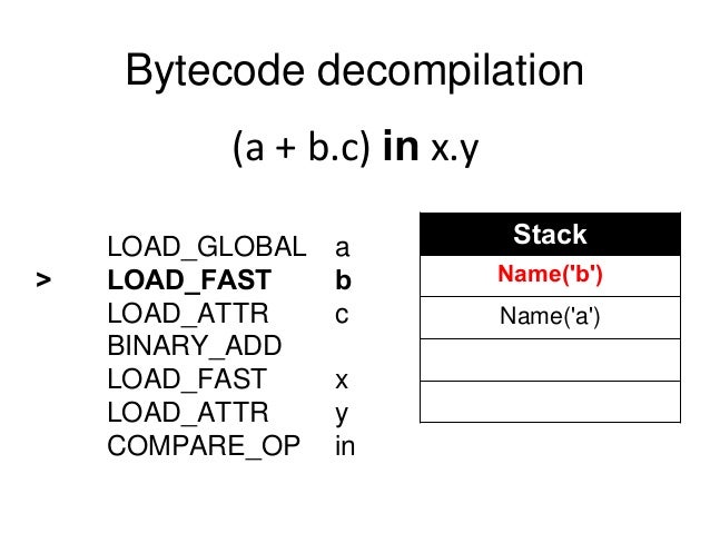 21. 21. (a + b.c) in x.y LOAD_GLOBAL a LOAD_FAST b LOAD_ATTR c BINARY_ADD LOAD_FAST x LOAD_ATTR y COMPARE_OP in Bytecode decompilation