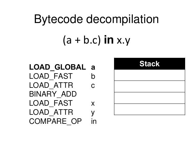 24. 24. Bytecode decompilation (a + b.c) in x.y LOAD_GLOBAL a > LOAD_FAST b LOAD_ATTR c BINARY_ADD LOAD_FAST x LOAD_ATTR y COMPARE_OP in Stack Name('b') Name('a')