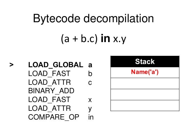 23. 23. Bytecode decompilation (a + b.c) in x.y > LOAD_GLOBAL a LOAD_FAST b LOAD_ATTR c BINARY_ADD LOAD_FAST x LOAD_ATTR y COMPARE_OP in Stack Name('a')
