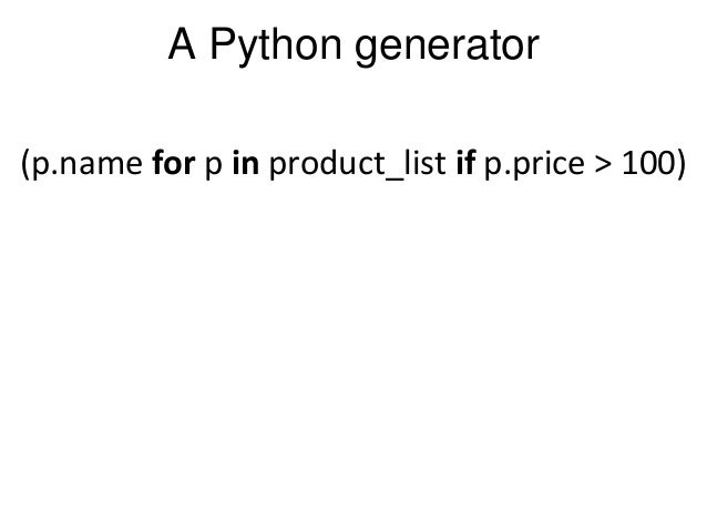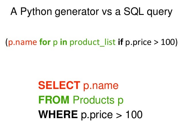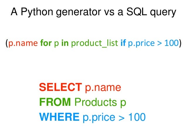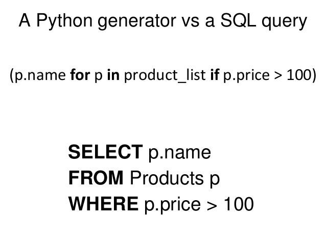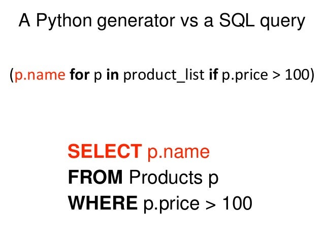 6. 6. (p.name for p in product_list if p.price > 100) SELECT p.name FROM Products p WHERE p.price > 100 A Python generator vs a SQL query