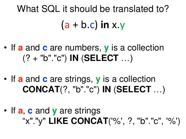 34. 34. • If a and c are numbers, y is a collection (? + "b"."c") IN (SELECT …) • If a and c are strings, y is a collection CONCAT(?, "b"."c") IN (SELECT …) • If a, c and y are strings “x"."y" LIKE CONCAT('%', ?, "b"."c", '%') What SQL it should be translated to? (a + b.c) in x.y
