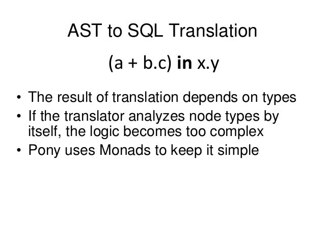 35. 35. • The result of translation depends on types • If the translator analyzes node types by itself, the logic becomes too complex • Pony uses Monads to keep it simple (a + b.c) in x.y AST to SQL Translation