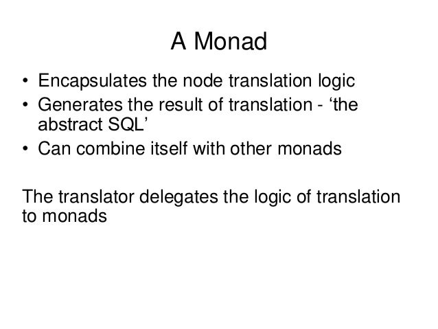 36. 36. • Encapsulates the node translation logic • Generates the result of translation - ‘the abstract SQL’ • Can combine itself with other monads The translator delegates the logic of translation to monads A Monad