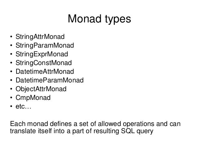 37. 37. • StringAttrMonad • StringParamMonad • StringExprMonad • StringConstMonad • DatetimeAttrMonad • DatetimeParamMonad • ObjectAttrMonad • CmpMonad • etc… Each monad defines a set of allowed operations and can translate itself into a part of resulting SQL query Monad types