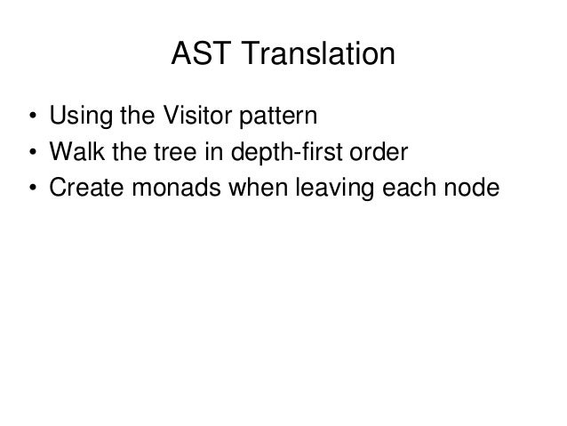 38. 38. AST Translation • Using the Visitor pattern • Walk the tree in depth-first order • Create monads when leaving each node