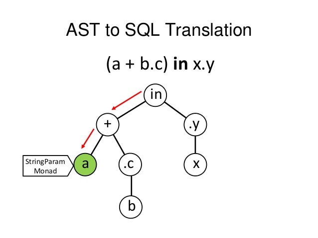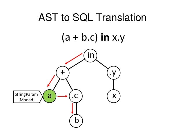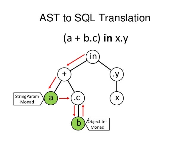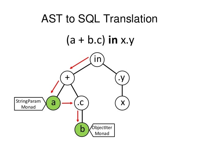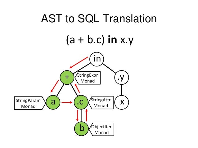 55. 55. (a + b.c) in x.y AST to SQL Translation in .y x + a .c b StringParam Monad ObjectIter Monad StringAttr Monad StringExpr Monad ObjectIter Monad StringAttr Monad Cmp Monad