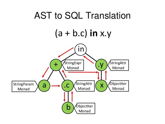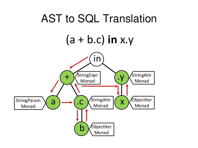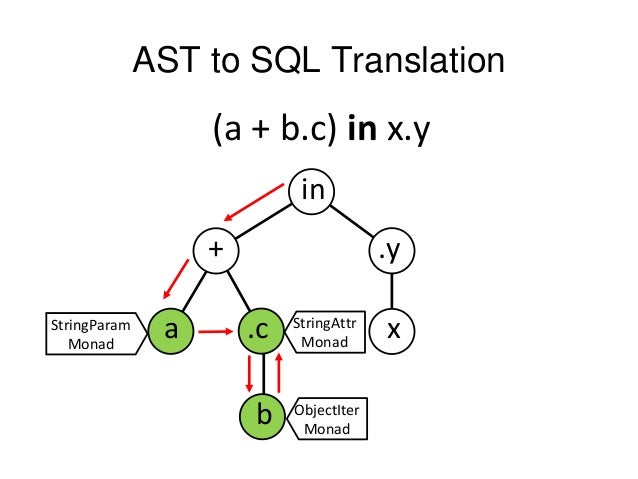 53. 53. (a + b.c) in x.y AST to SQL Translation in .y x + a .c b StringParam Monad ObjectIter Monad StringAttr Monad StringExpr Monad ObjectIter Monad StringAttr Monad