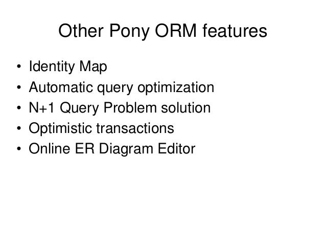 59. 59. Other Pony ORM features • Identity Map • Automatic query optimization • N+1 Query Problem solution • Optimistic transactions • Online ER Diagram Editor