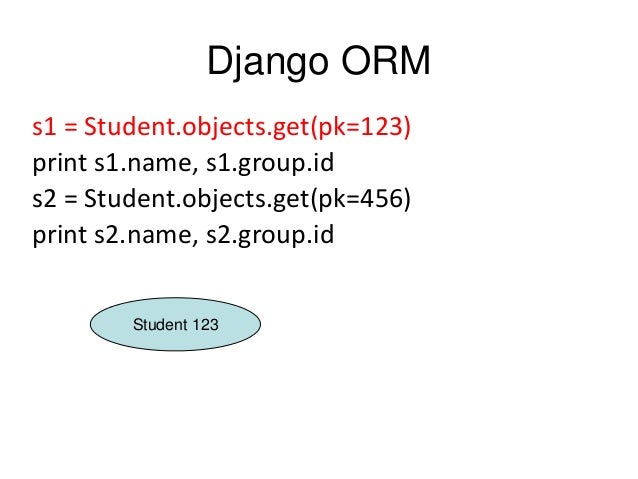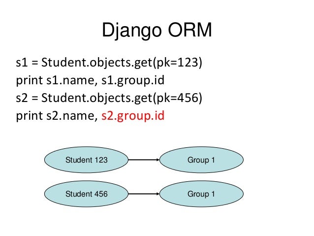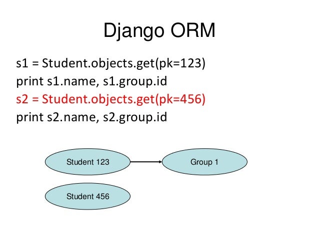 64. 64. Django ORM s1 = Student.objects.get(pk=123) print s1.name, s1.group.id s2 = Student.objects.get(pk=456) print s2.name, s2.group.id Student 123 Student 456 Group 1 Group 1