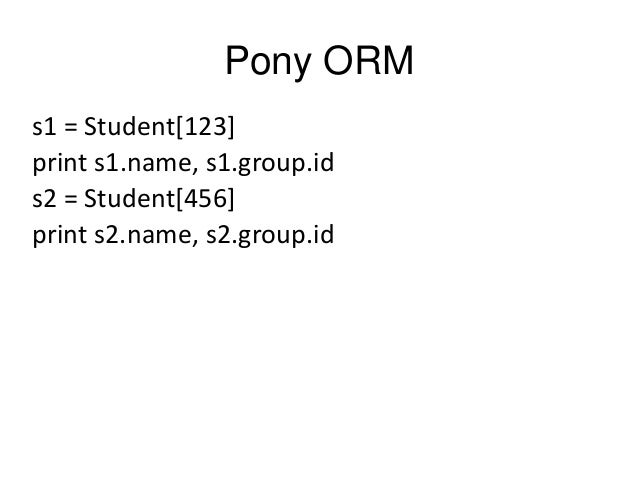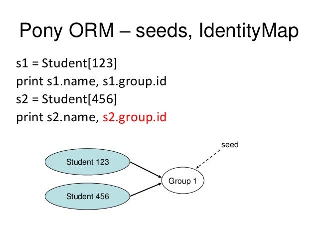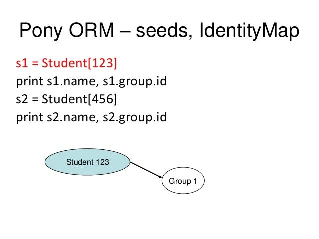 70. 70. Pony ORM – seeds, IdentityMap s1 = Student[123] print s1.name, s1.group.id s2 = Student[456] print s2.name, s2.group.id Student 123 Student 456 Group 1 seed