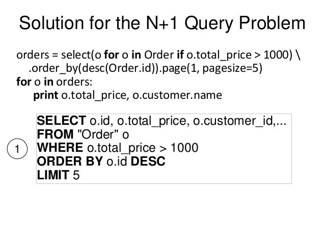 71. 71. Solution for the N+1 Query Problem orders = select(o for o in Order if o.total_price > 1000) .order_by(desc(Order.id)).page(1, pagesize=5) for o in orders: print o.total_price, o.customer.name 1 SELECT o.id, o.total_price, o.customer_id,... FROM "Order" o WHERE o.total_price > 1000 ORDER BY o.id DESC LIMIT 5