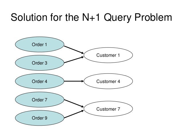 73. 73. Order 1 Order 3 Order 4 Order 7 Order 9 Customer 1 Customer 4 Customer 7 Solution for the N+1 Query Problem One SQL query