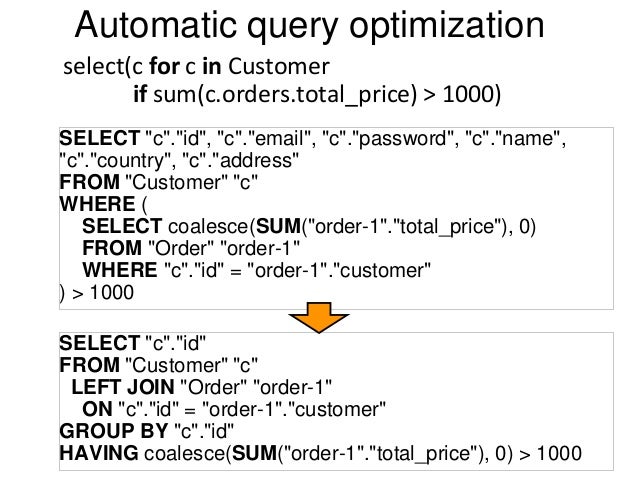 75. 75. Automatic query optimization select(c for c in Customer if sum(c.orders.total_price) > 1000) SELECT "c"."id", "c"."email", "c"."password", "c"."name", "c"."country", "c"."address" FROM "Customer" "c" WHERE ( SELECT coalesce(SUM("order-1"."total_price"), 0) FROM "Order" "order-1" WHERE "c"."id" = "order-1"."customer" ) > 1000 SELECT "c"."id" FROM "Customer" "c" LEFT JOIN "Order" "order-1" ON "c"."id" = "order-1"."customer" GROUP BY "c"."id" HAVING coalesce(SUM("order-1"."total_price"), 0) > 1000