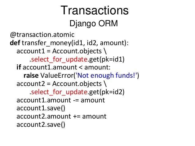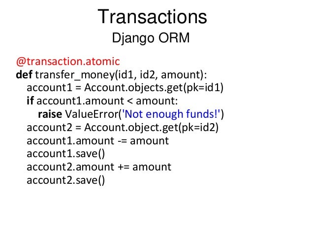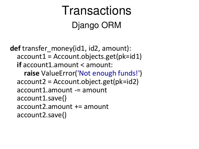 76. 76. Transactions def transfer_money(id1, id2, amount): account1 = Account.objects.get(pk=id1) if account1.amount < amount: raise ValueError('Not enough funds!') account2 = Account.object.get(pk=id2) account1.amount -= amount account1.save() account2.amount += amount account2.save() Django ORM