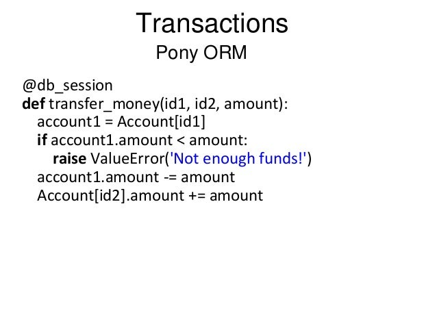 79. 79. @db_session def transfer_money(id1, id2, amount): account1 = Account[id1] if account1.amount < amount: raise ValueError('Not enough funds!') account1.amount -= amount Account[id2].amount += amount Transactions Pony ORM