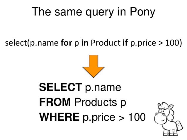 8. 8. The same query in Pony SELECT p.name FROM Products p WHERE p.price > 100 select(p.name for p in Product if p.price > 100)