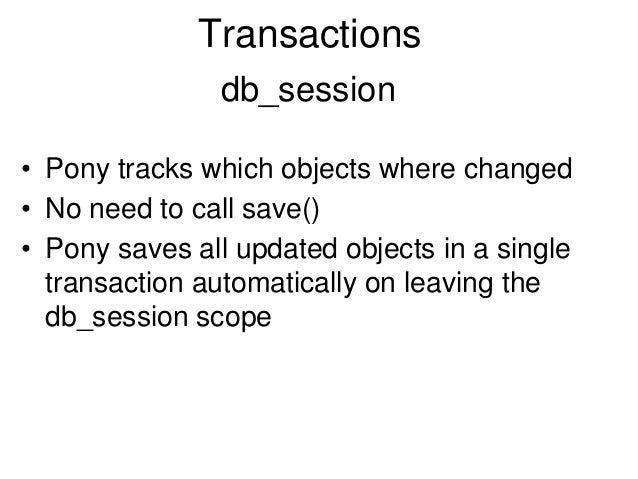 80. 80. db_session • Pony tracks which objects where changed • No need to call save() • Pony saves all updated objects in a single transaction automatically on leaving the db_session scope Transactions