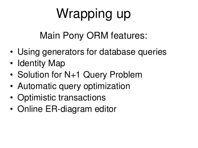 86. 86. Main Pony ORM features: • Using generators for database queries • Identity Map • Solution for N+1 Query Problem • Automatic query optimization • Optimistic transactions • Online ER-diagram editor Wrapping up