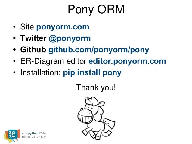 88. 88. • Site ponyorm.com • Twitter @ponyorm • Github github.com/ponyorm/pony • ER-Diagram editor editor.ponyorm.com • Installation: pip install pony Thank you! Pony ORM