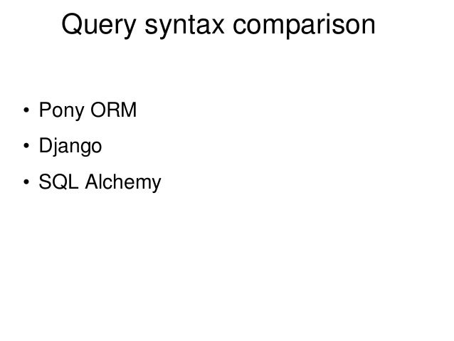 9. 9. • Pony ORM • Django • SQL Alchemy Query syntax comparison