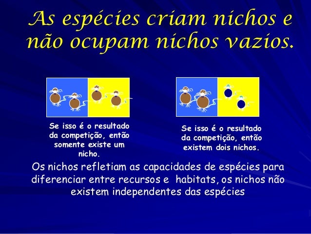 10. 10. As espécies criam nichos enão ocupam nichos vazios. .. .. .. .. .. .. .. .. Se isso é o resultado Se isso é o resultado da competição, então da competição, então somente existe um existem dois nichos. nicho.Os nichos refletiam as capacidades de espécies paradiferenciar entre recursos e habitats, os nichos não existem independentes das espécies