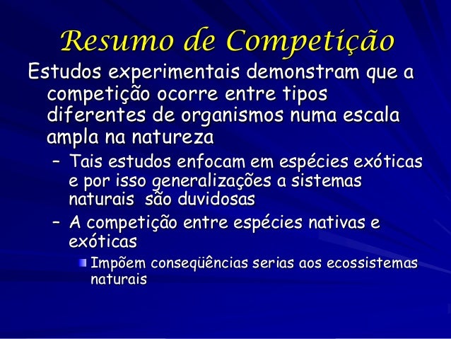 100. 100. Resumo de CompetiçãoEstudos experimentais demonstram que a competição ocorre entre tipos diferentes de organismos numa escala ampla na natureza – Tais estudos enfocam em espécies exóticas e por isso generalizações a sistemas naturais são duvidosas – A competição entre espécies nativas e exóticas Impõem conseqüências serias aos ecossistemas naturais